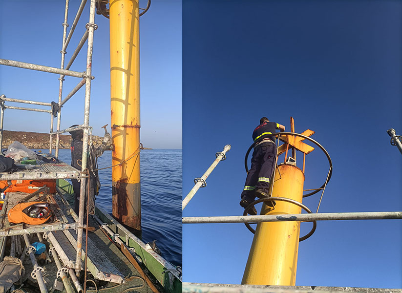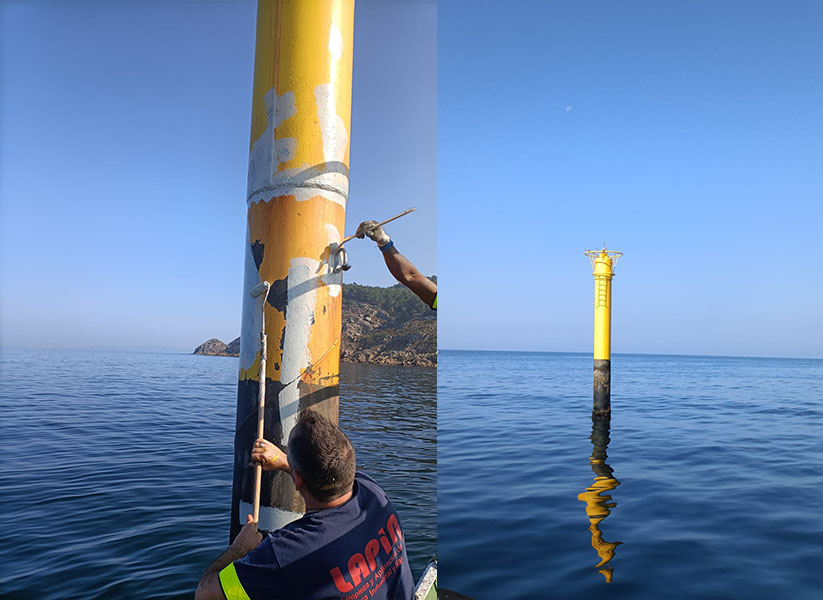 Este proceso garantiza una protección óptima contra los elementos marinos y asegura la visibilidad de la baliza, fundamental para la seguridad marítima.